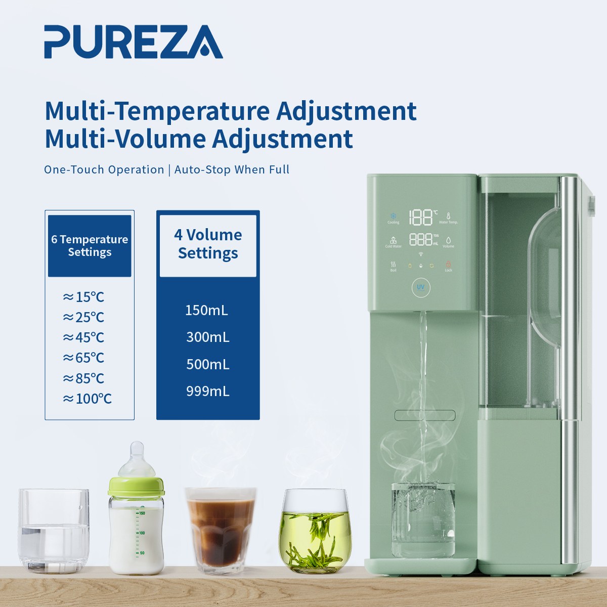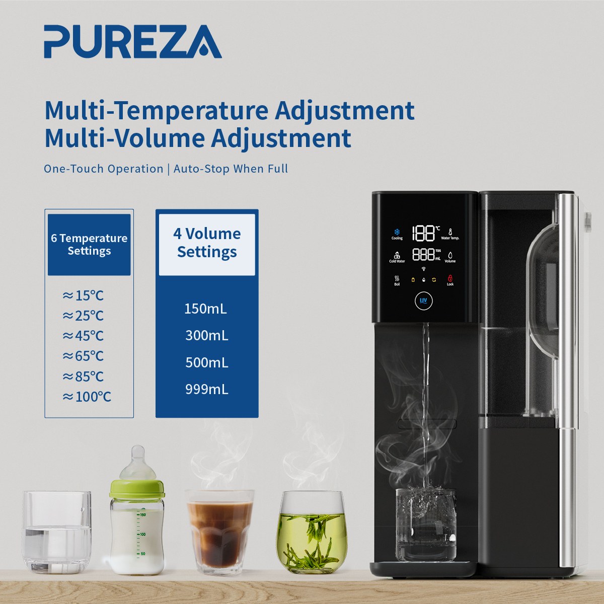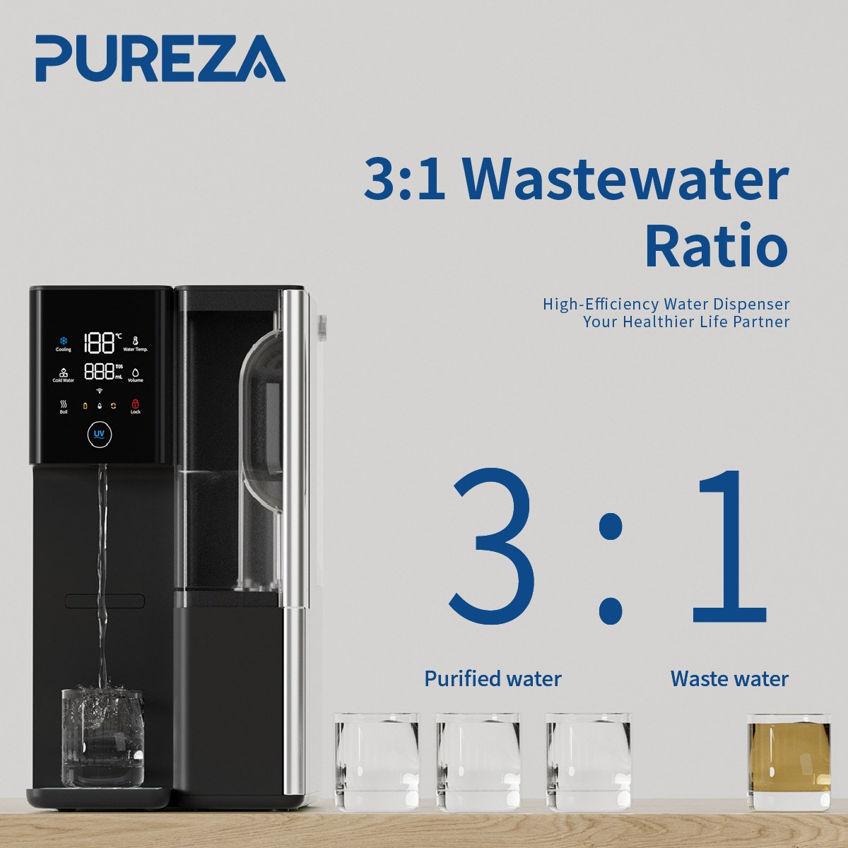 Ce produit est équipé d'un tout nouveau système de filtration par osmose inverse en quatre étapes, un allié santé de confiance pour votre eau potable au quotidien. Il offre une eau chaude et froide instantanée, un ratio d'eaux usées de 3:1 et un réservoir d'eau portable, pour plus de confort et de praticité au quotidien.