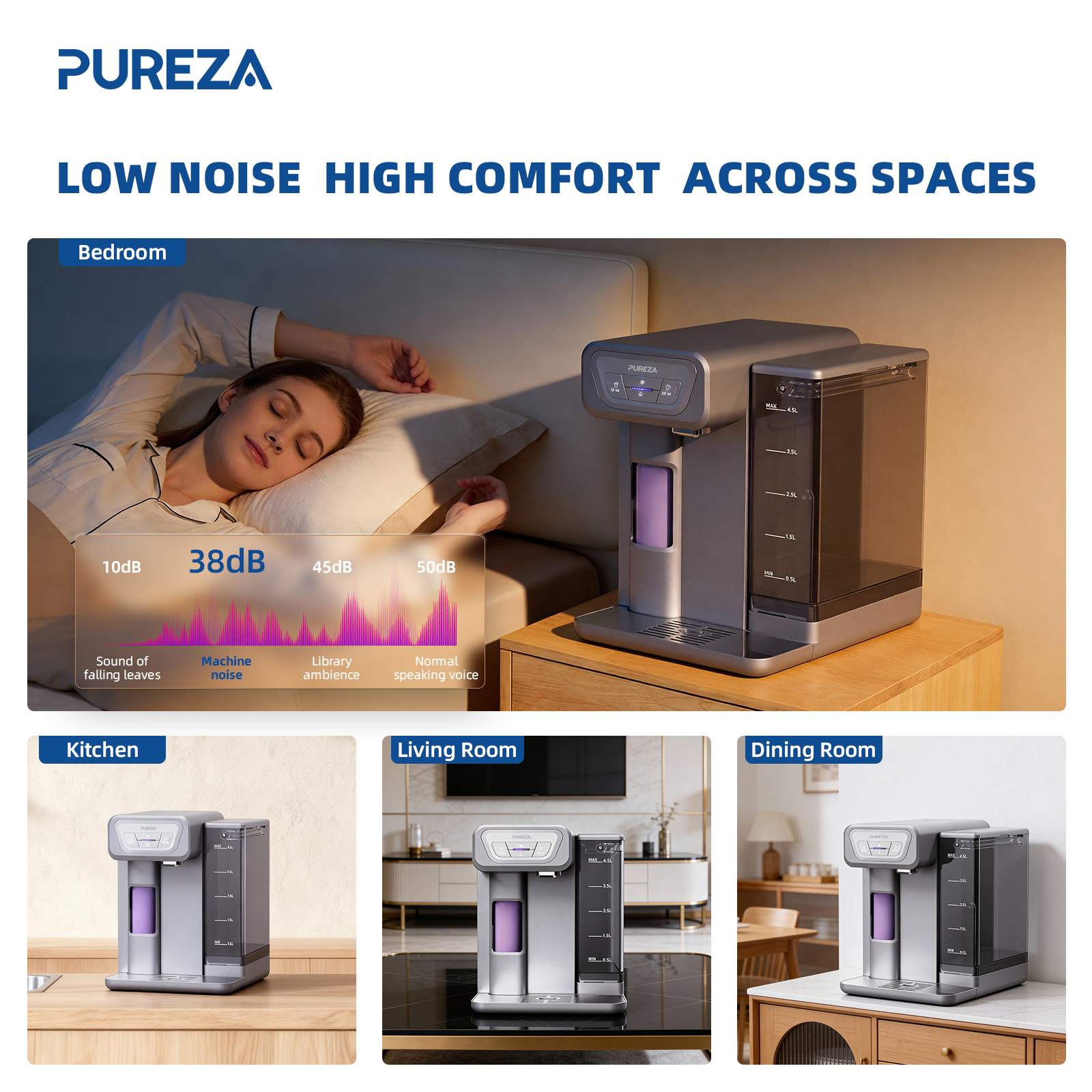 Avec un niveau sonore de seulement 38 dBA, le PU-T02 est remarquablement silencieux, idéal pour les chambres, les bureaux et les cuisines ouvertes. Associé à un système haute performance consommant seulement 1 kWh/jour, il fournit de l'eau purifiée et fraîche en toute discrétion et permet des économies d'énergie à long terme.