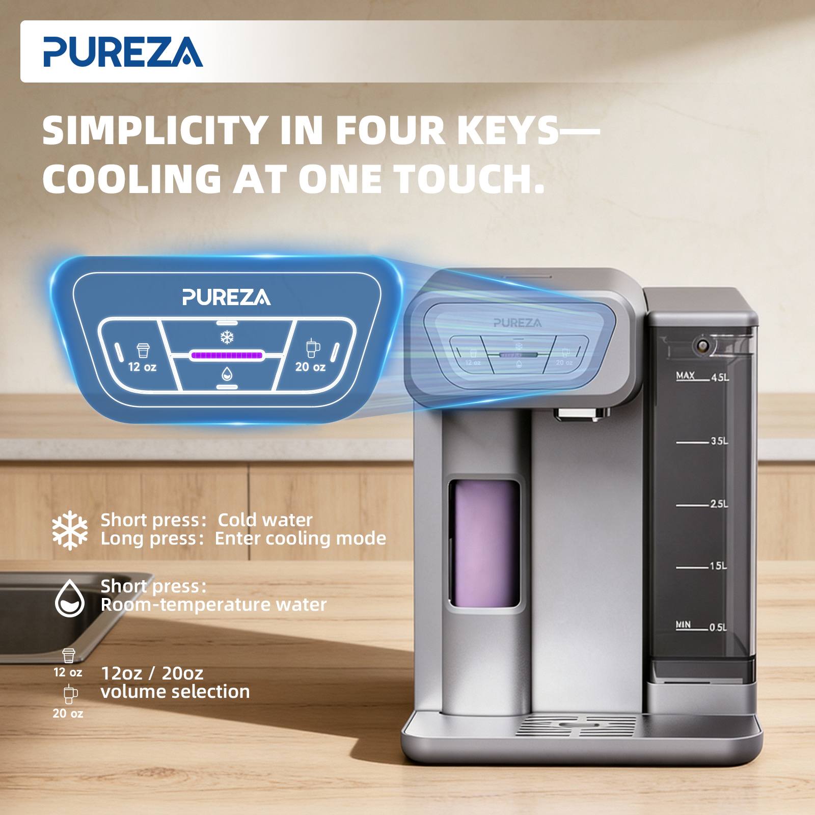 Doté d'un grand réservoir d'eau froide de 1,2 L, le PU-T02 peut stocker une plus grande quantité d'eau fraîche, garantissant un refroidissement stable même lors d'utilisations répétées. Son réservoir d'eau de 4,5 L est idéal pour les familles et les petits bureaux, réduisant le temps d'attente et vous assurant une eau fraîche toujours à portée de main.