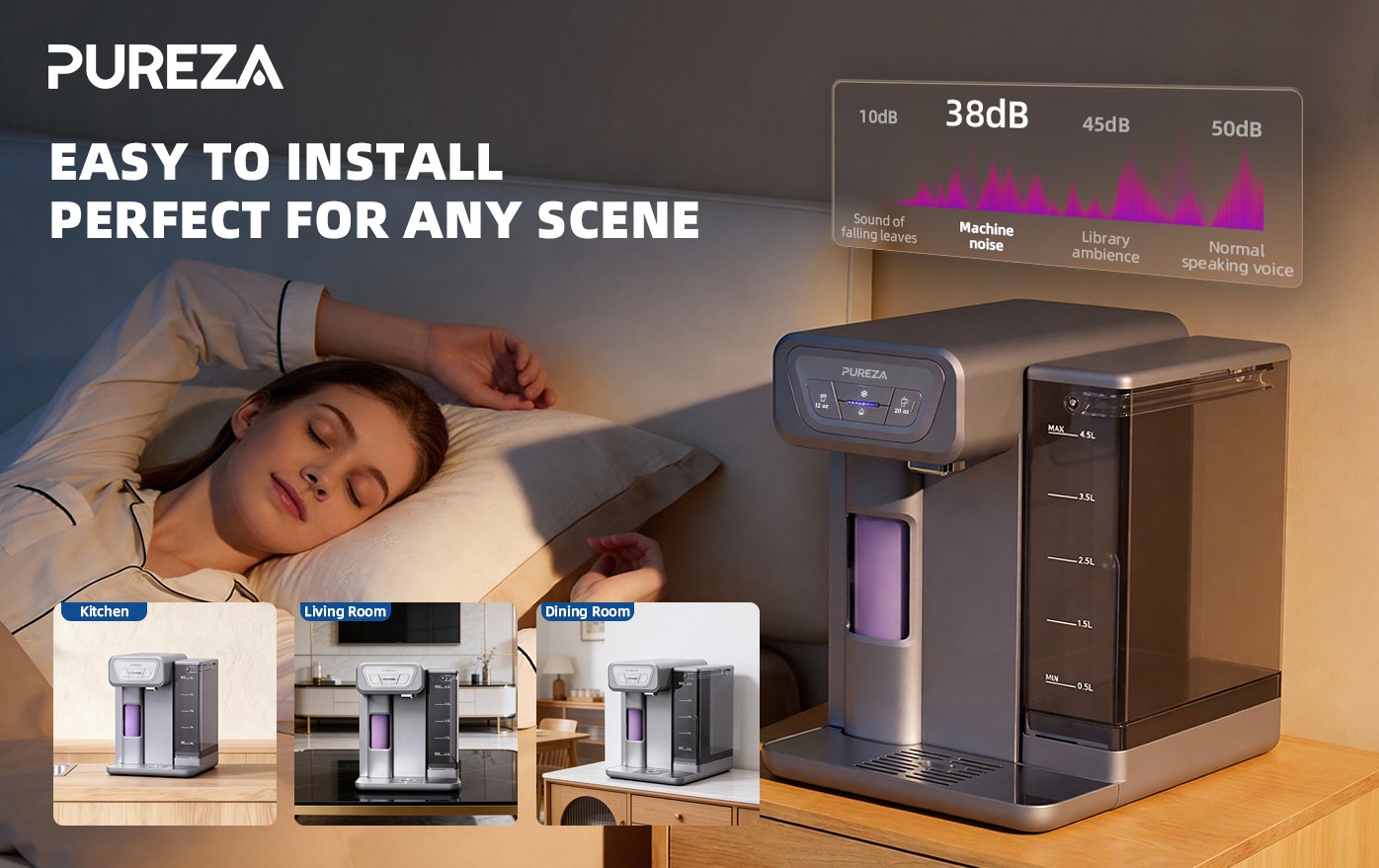 Fonctionnement silencieux : Avec un niveau sonore de seulement 38 dBA, il peut être placé dans les chambres sans perturber le sommeil.
